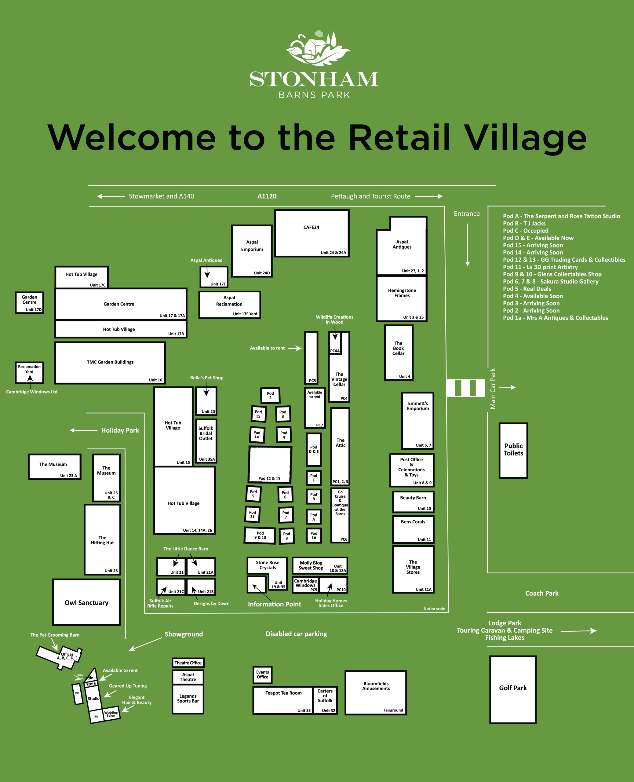 On this page, you will find everything you need to know about the shops in the Retail Village in more detail. Once you click on your required shop you will find information on what they have to offer and their contact details. If they have a website you can click on the link which will take you directly through to the shop's homepage.