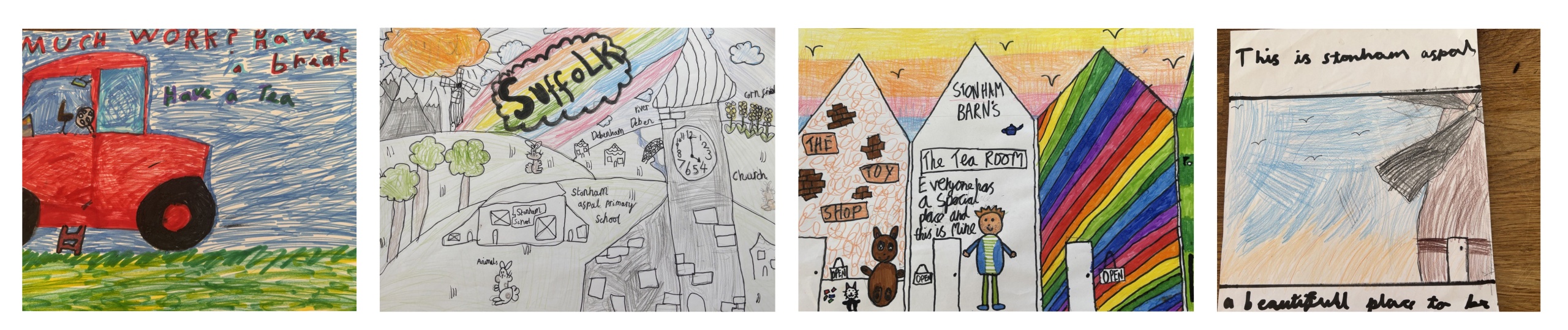 The 50 entries received from the children were diverse and varied as expected. First Place was awarded to Scarlet Dodd of Pettaugh (aged 7), who put together a delightful Suffolk village scene featuring Stonham Aspal Primary School, the village of Debenham and the River Deben along with a church, windmill, cornfield and animals. Jenson Connor from Earl Stonham (aged 7) was awarded Second Prize having submitted a drawing of a windmill, while joint Third Prize was awarded to Maisy Fiddamam from Stonham Aspal (aged 9) who featured a single red tractor in a field and Mabel Harrison also of Stonham Aspal (aged 9) who featured the tearooms and toy shop at Stonham Barns Park beside a creatively designed ‘technicoloured’ shop.